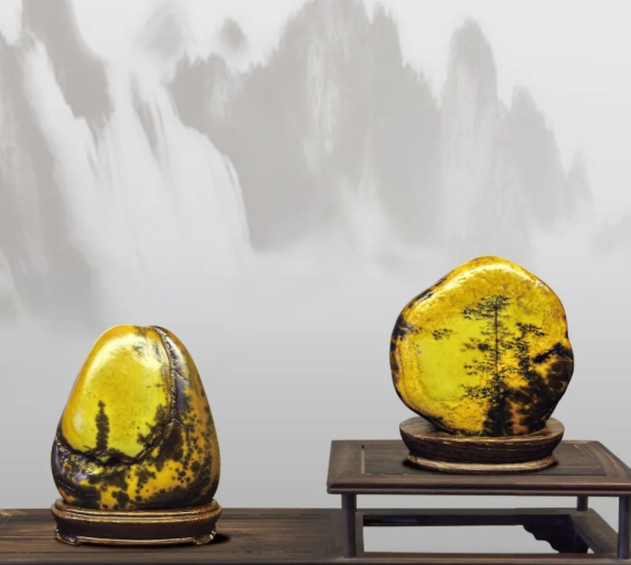 比如类画石中的山景石,有石山,有土山;有近山,有远山;有单彩,有多彩;有泼墨,有线描;有独峰,有双峰,有群峰;有高低式,有宾主式,有平峦式,有环抱式;有重峦叠嶂,有群山连绵;有悬崖峭壁,有峡谷雄关;有坡田交错,有矶陀相间……山中有花草林木,有飞禽走兽,有道路溪桥,有流水瀑布,有村姑野老,有茅舍楼阁……加上日月星光和雨雪云雾的映衬;加上一日之中昼与夜、早与晚的变化,一年之中春夏秋冬四季的变化,仅仅一个山景石就给我们呈现出多少优美的景象啊!而山景石只是许多种景物石中的一种,景物石又只是许多种类画石或类雕塑石中的一种,而类画石或类雕塑石又只是几个基本种类奇石中的一种,由此可见奇石的审美内容真是无限丰富多彩。